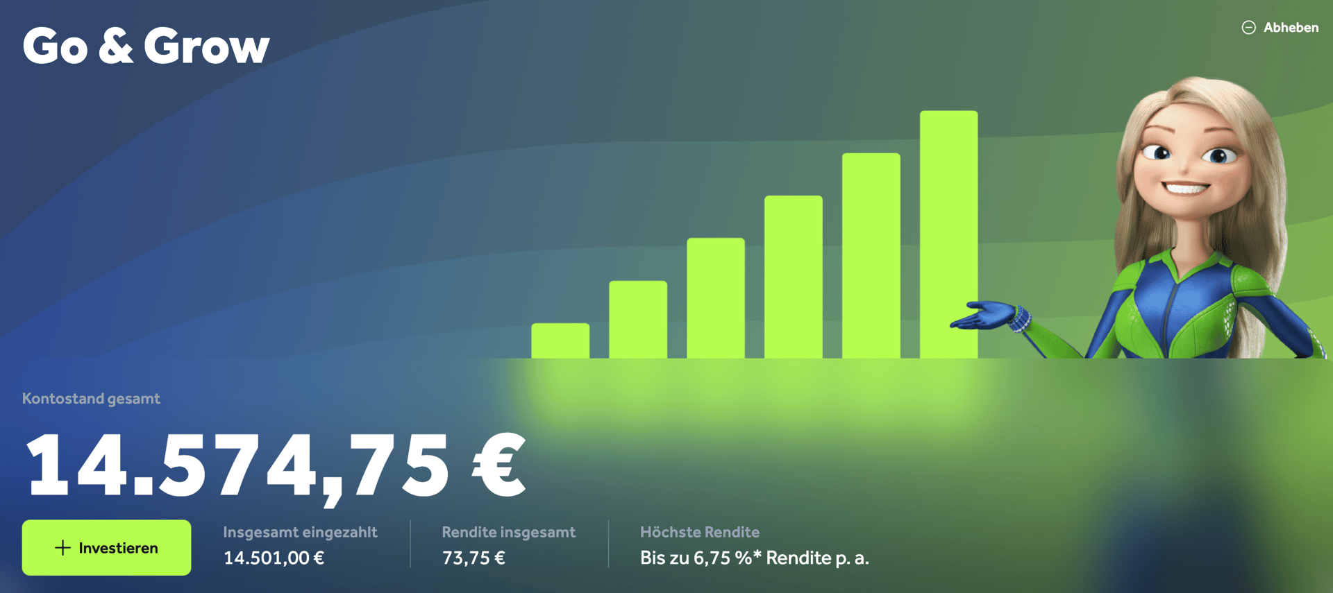 - Einfachheit: Du musst keine komplizierten Finanzstrategien verstehen. Einfach einzahlen und bis zu 6,75 % Rendite jährlich erhalten.